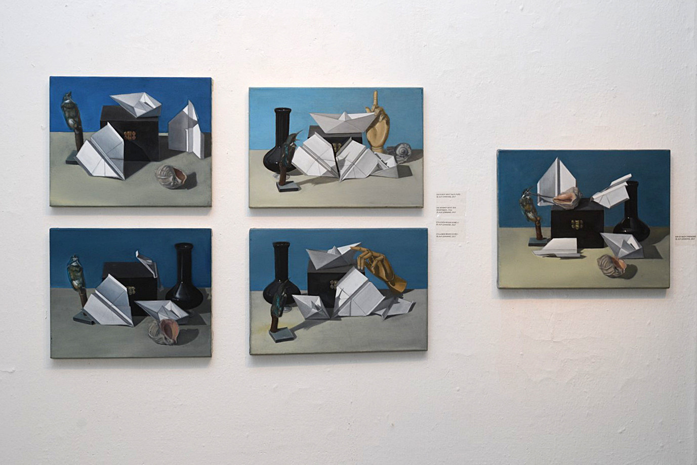Der Fokus in der Ausstellung von Walter Battisti ist auf die Malerei gerichtet. Der Wahldresdner, der in Bozen geboren und aufgewachsen ist widmet sich seit Jahrzehnten intensiv der Recherche zur Tradition in der Malerei. Seine kleinen und großformatigen Stillleben sind der historischen Manier der Alten Meister entlehnt. Die Suche ist jene nach klassischen, fast formelhaft vereinfachten Kompositionen. Aus einer monochrom anmutenden, farblichen Tiefe heraus wirken die präzis gemalten Gegenstände aus dem Alltag, wie Vasen, ausgestopfte Tauben oder Blumen wertvoller. Objekte wie ein Fächer oder eine alte Geige mit dem Davidstern hingegen schaffen historische Bezüge. Die Faltwerke wie Papierschiffe und Papierflugzeuge sind metaphorisch zu verstehen. Sie lassen sich unter anderem auf das Meistergedicht „Das Trunkene Schiff“ von Arthur Rimbaud zurückführen.